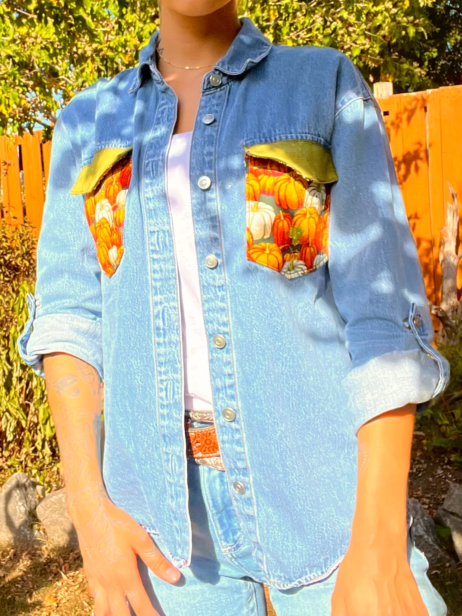 This ONE OF ONE denim button-down is made from sustainably-sourced materials including recycled canvas tote bags, a secondhand denim shirt and some fabric from a recycled blouse.